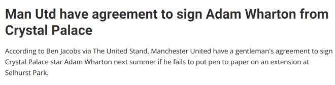 曼联明年肯定会引援的位置是中场,这是100%确凿无疑的计划。而水晶宫的亚当·沃顿则是热门人选之一,转会专家本·雅各布斯披露,一项君子协定有助于红魔签下这名21岁的英格兰球员。