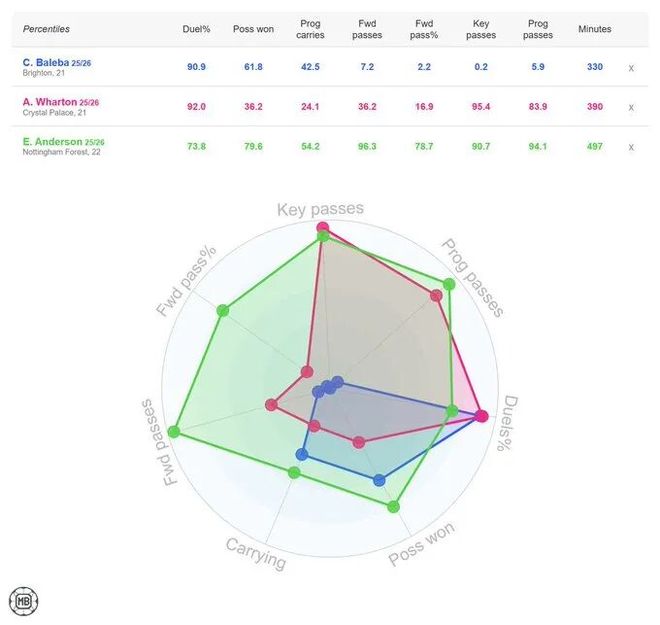 在与曼联传闻最多的3名中场球员中,沃顿的传球和对抗能力最强,巴莱巴则擅长对抗,埃利奥特·安德森最为全面,因此现在球迷认为同时签下沃顿和安德森,性价比比布莱顿标价1.2亿英镑的巴莱巴更好。